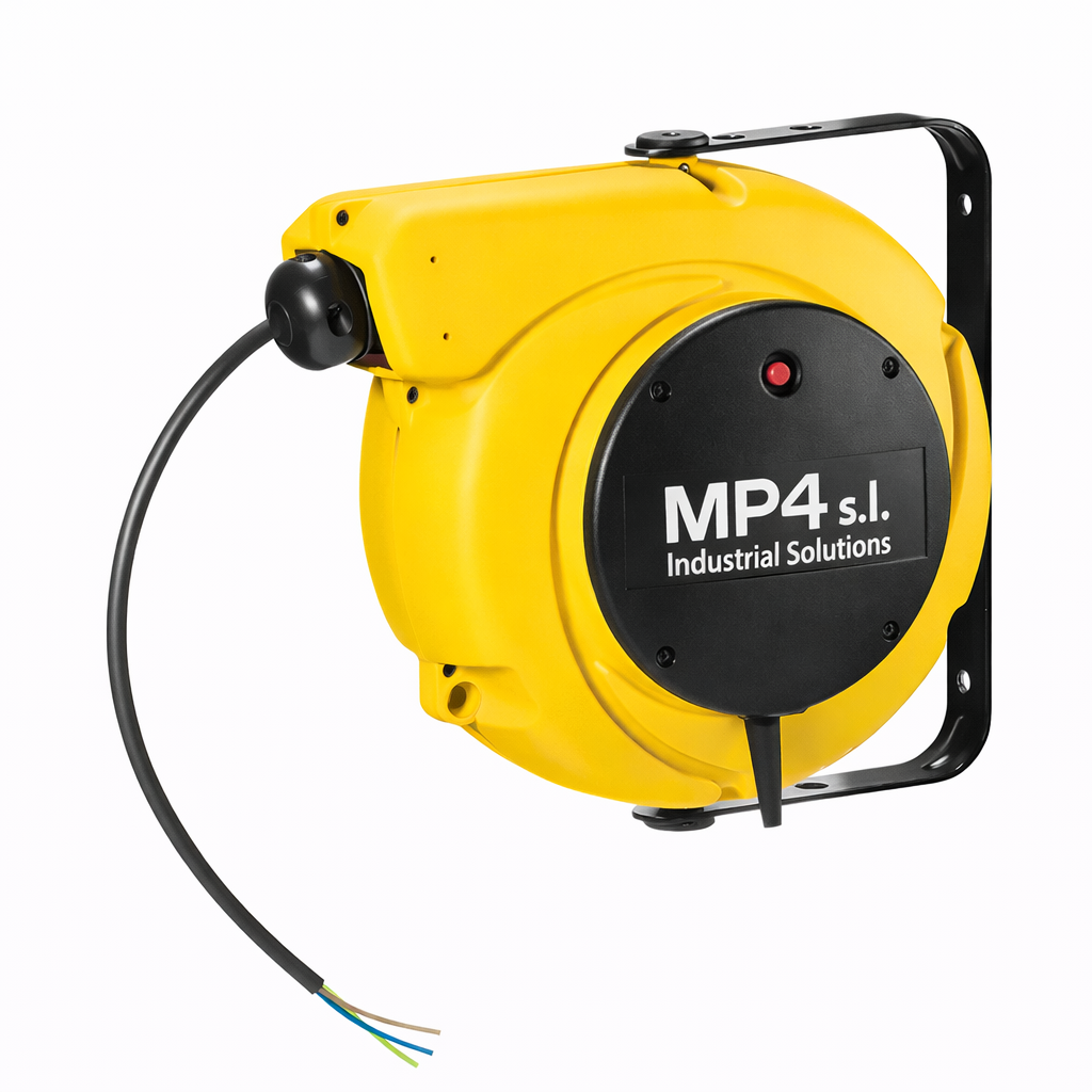 El enrollador cuenta con elementos estructurales fabricados en plástico antiimpacto de alta resistencia. Incorpora una boca guía-cable con rodillos que facilita un desplazamiento suave y controlado. Dispone de un dispositivo de bloqueo del cable mediante cremallera, ajustable cada 50 cm, fácilmente desmontable cuando se requiere que el cable permanezca en tracción constante. Además, incluye doble contacto de toma de tierra para una mayor seguridad.